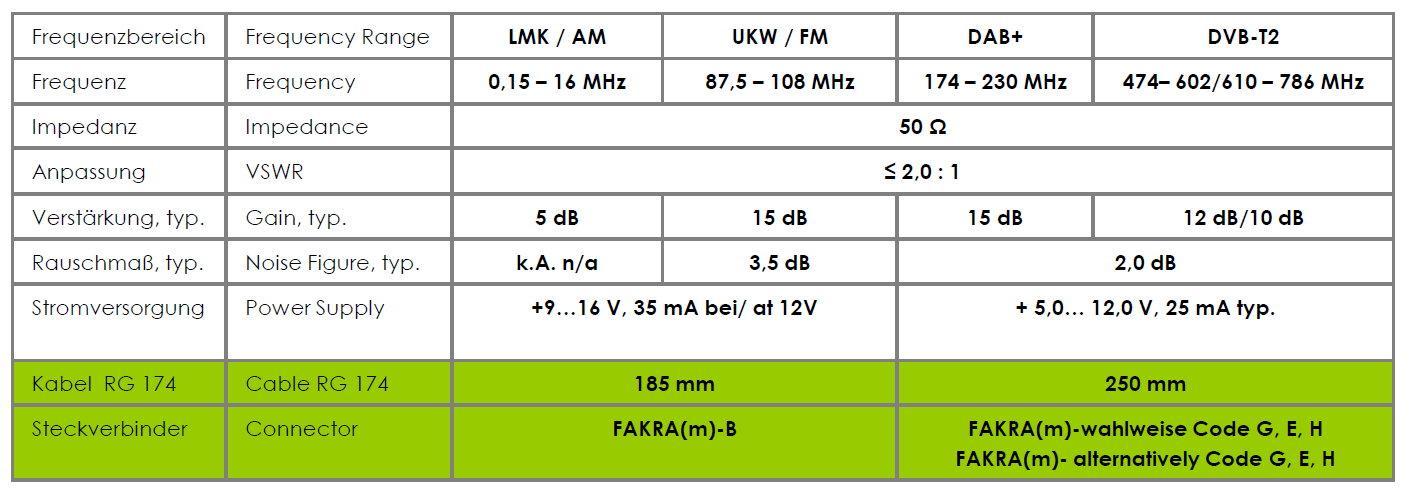 - Verstärkung: DAB+: 15 dB - (174-230 MHz)