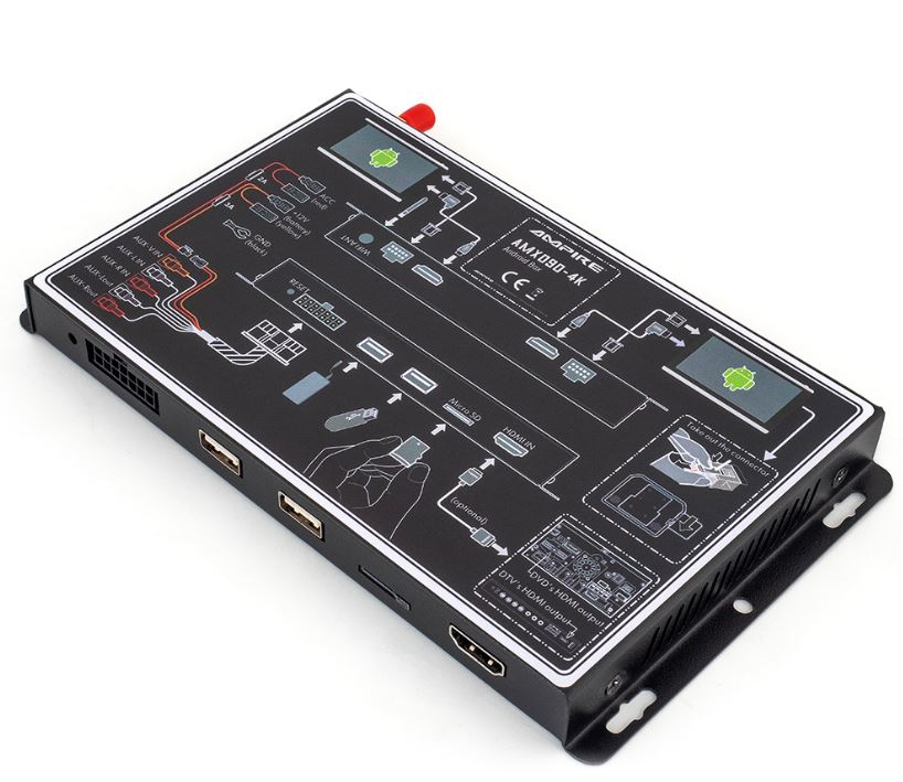 Die beiden Displays sind eingerahmt in einem wunderschönen, per CNC gefrästen, Aluminiumgehäuse und ist nur 7mm flach. Der AMX090-4K kann den Ton drahtlos über optionale Infrarot- oder Bluetooth-Kopfhörer wiedergeben, Alternativ hat jeder Monitor einen integrierten Lautsprecher. Außerdem ist der Ton auch auf Cinchausgängen an der Android Box verfügbar um z.B. diesen an den AUX-Eingang ihres werkseitigen Autoradios anschließen zu können.