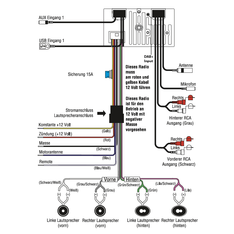 | Medien: | AUX-In, Bluetooth, DAB+, USB vorne |