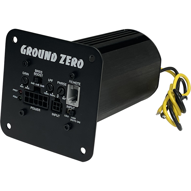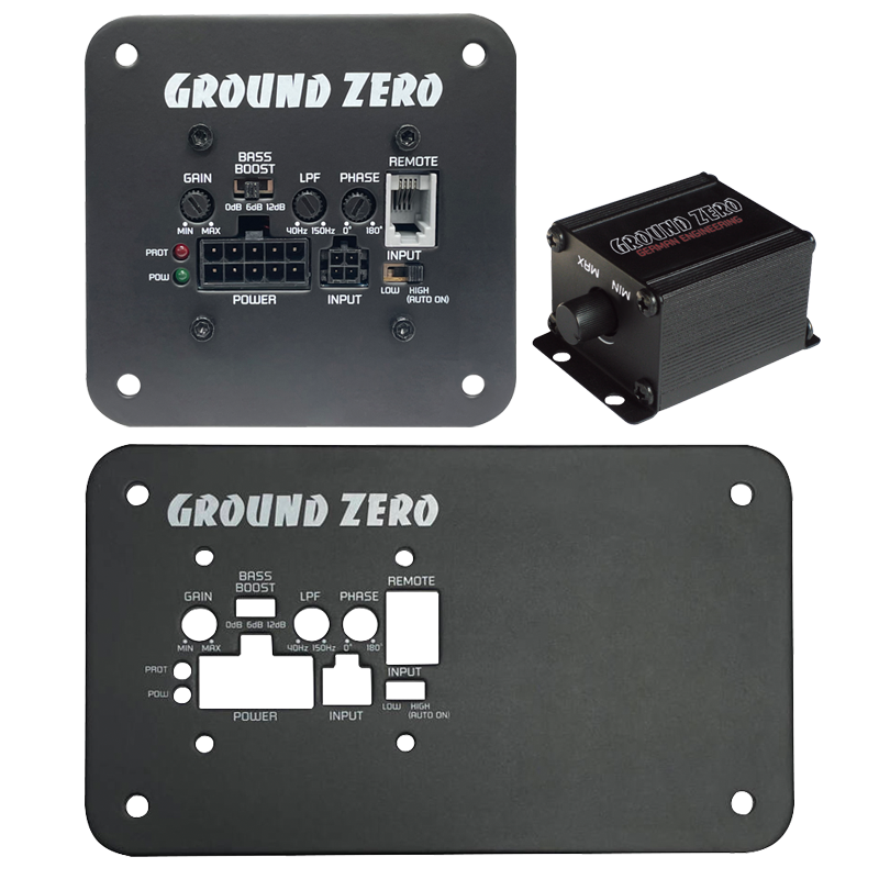 Ground Zero GZ SUB-AMP 300 - Active module for many Ground Zero subwoofer enclosures 1-channel, 2-ohm stable amplifier module with Class D circuitry, integrated active crossover, and bass boost Class D technology Variable active crossover and bass boost Features Mono power amplifier module Highly efficient Class D technology 2 Ohm stable Adjustable low-pass filter Adjustable bass boost function Adjustable input sensitivity Adjustable power delay Thermal protection circuit Short-circuit protection circuit Overload protection circuit Wired level remote control included Two front panels included