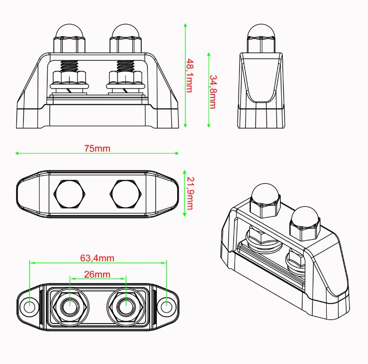 Features: Multiple terminals with M8 stainless steel screws (13mm wrench size)