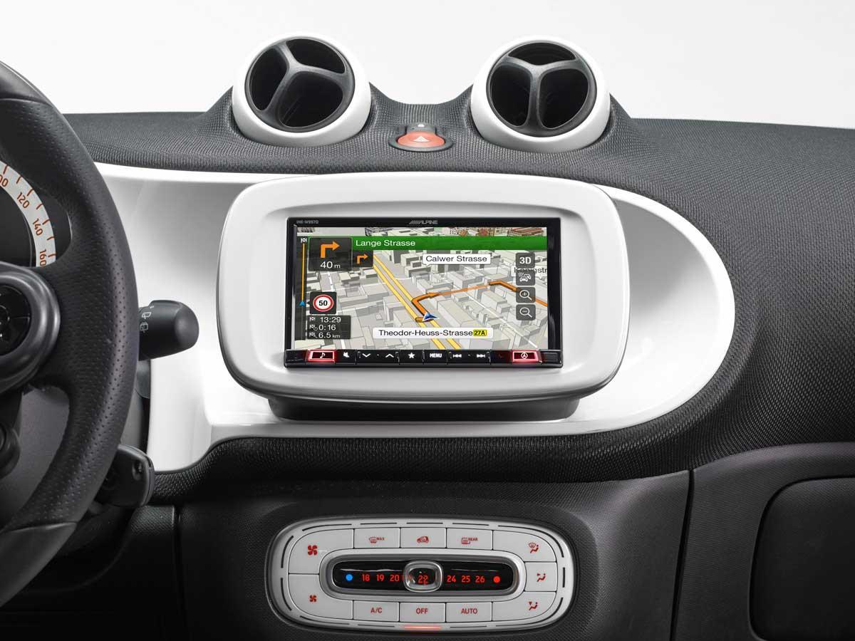- The INE-W710S453W offers all the benefits of state-of-the-art iGO PRIMO navigation software and is compatible with all current smartphones from Apple and Samsung via Apple Car Play or Android Auto . For unadulterated entertainment in the Smart, DAB + digital radio, USB video playback, HDMI connectivity and the latest Bluetooth technology are also on board.