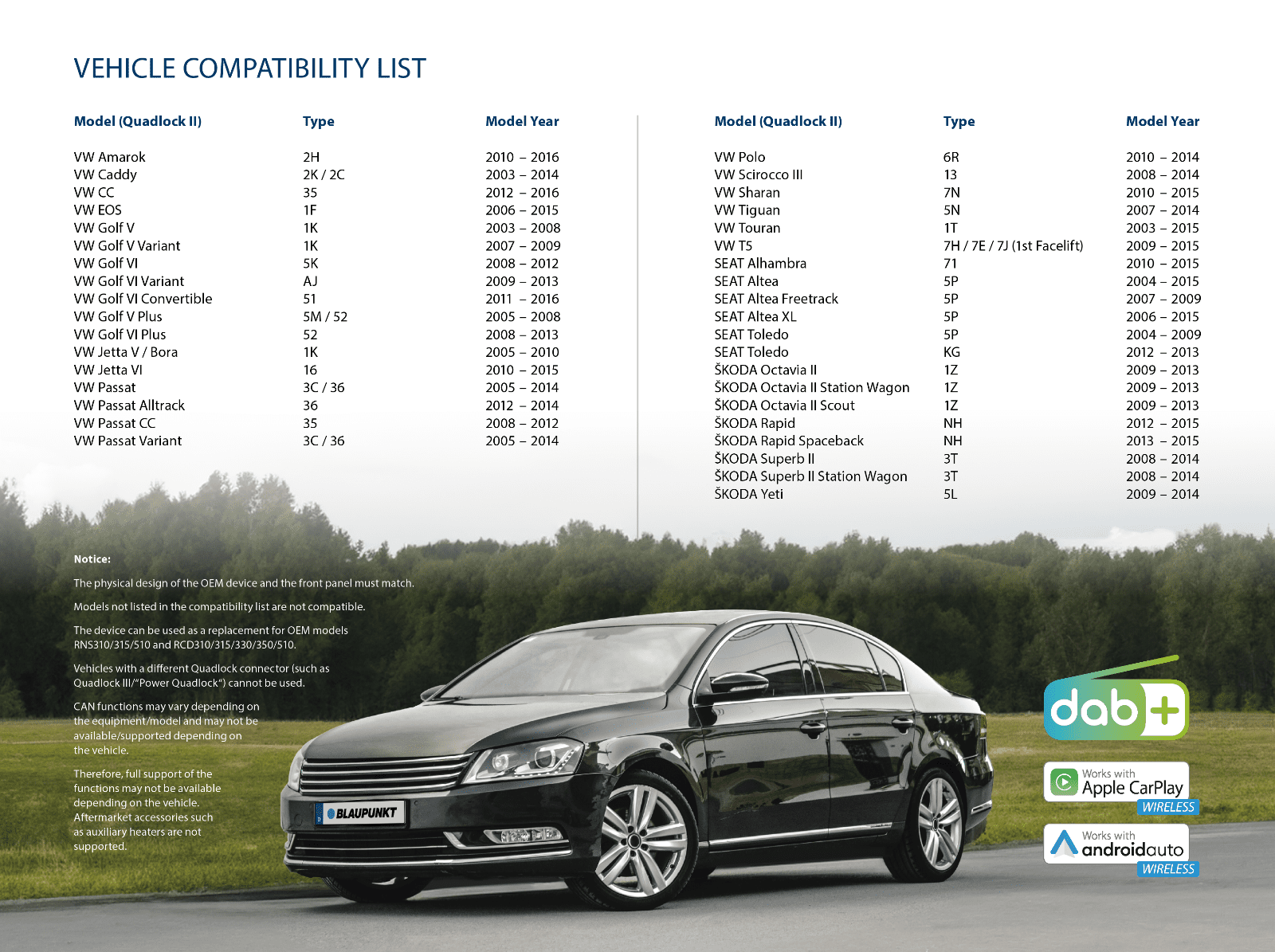 | VW: | Polo, Passat, CC, Amarok, Caddy, Eos, Golf 5, Golf 6, Jetta, Scirocco, Sharan, T5, Tiguan, Touran |