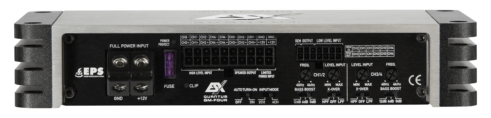 The roughly palm-sized 2-channel mini amplifier QUANTUM QM-TWO astonished ESX fans and car hi-fi connoisseurs immediately upon its launch. The small powerhouse with a whopping 240 watts RMS of power was immediately touted as an insider tip. After the improved V2 version topped that last year with an incredible 300 watts RMS of power, ESX is now following up with two additional models in the QM class: The powerful QM-FOUR amplifier is now available for 4-channel applications, and anyone wanting to drive a separate subwoofer can now opt for the new QM-ONE monoblock. Both power bars deliver a whopping 360 watts RMS and are visually perfectly matched. All models utilize modern and efficient Class D technology, combined with EPS®, top features, and perfect sound characteristics. The QM-ONE monoblock is not only visually the perfect partner for the QM-FOUR. If a separate woofer is also required, its application is clearly defined. With a whopping 360 watts RMS at 2 Ω, it provides ample power, and the bass level can even be conveniently adjusted via the remote control.